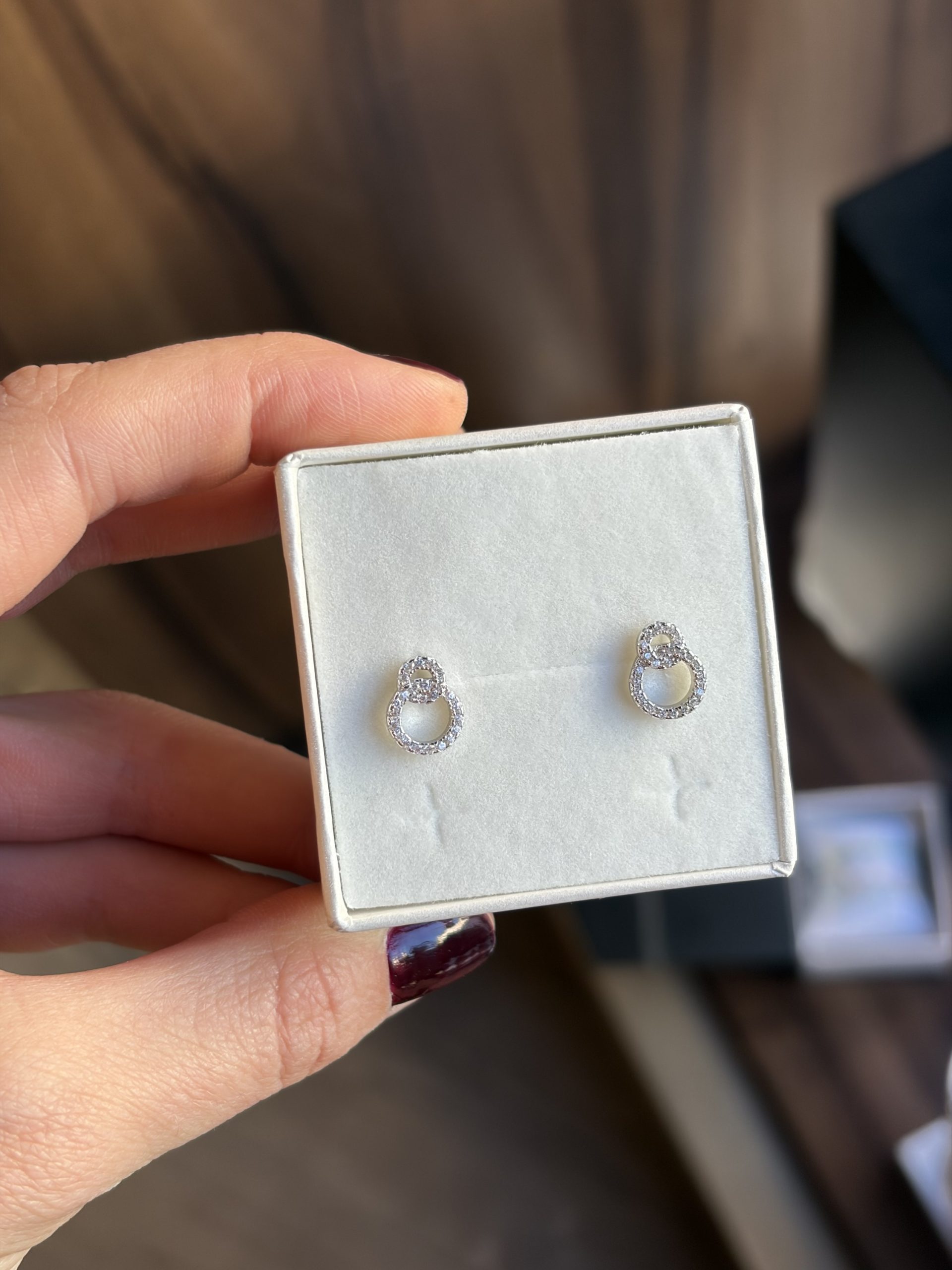 Ezüst fülbevaló kettő egymásba fonódó karika – stekkeres. 925 finomságú ezüst.