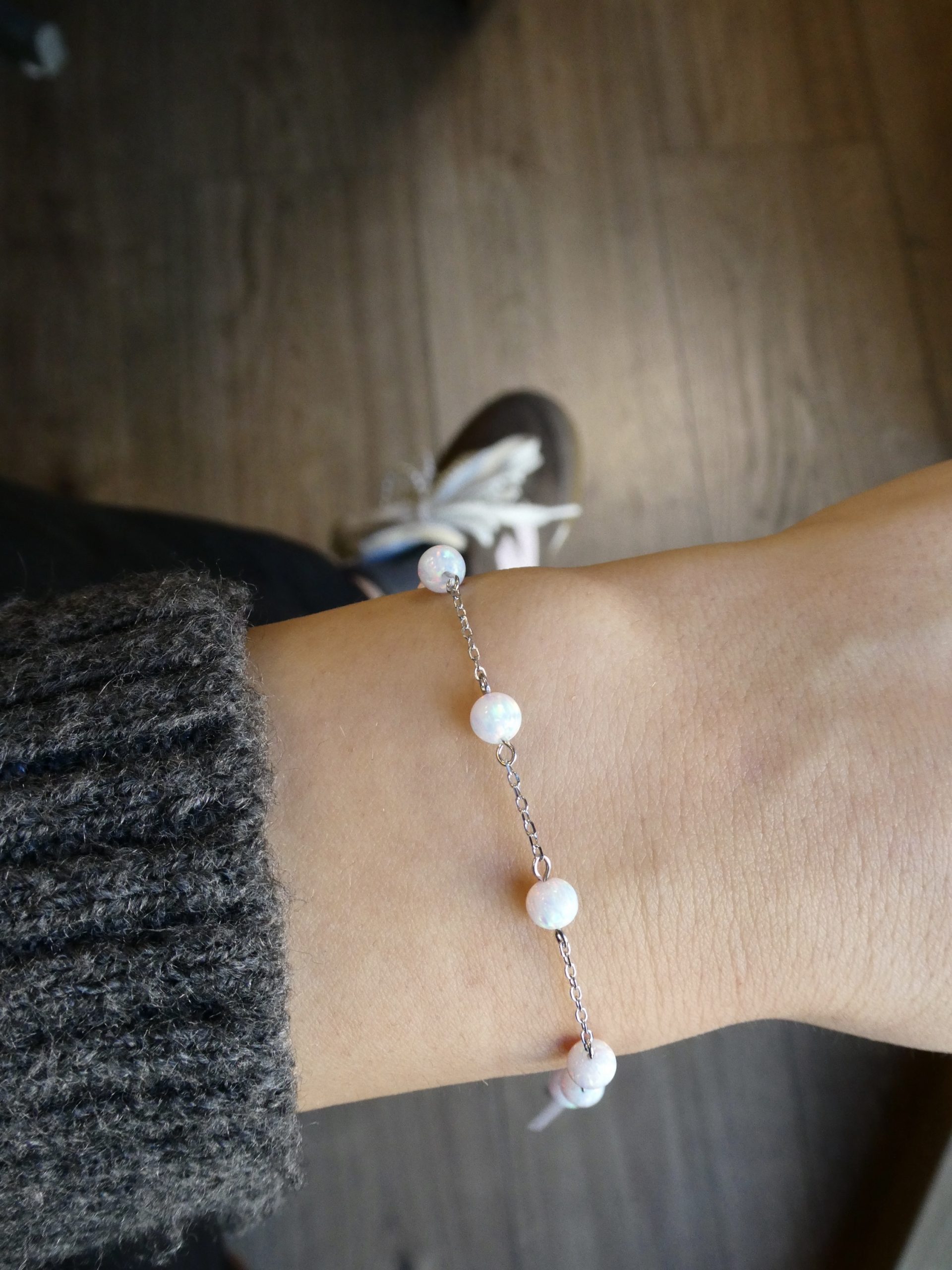 Ezüst karkötő fehér opállal. Méret: 16 cm + hosszabbító 3 cm. 925 finomságú ezüst.
