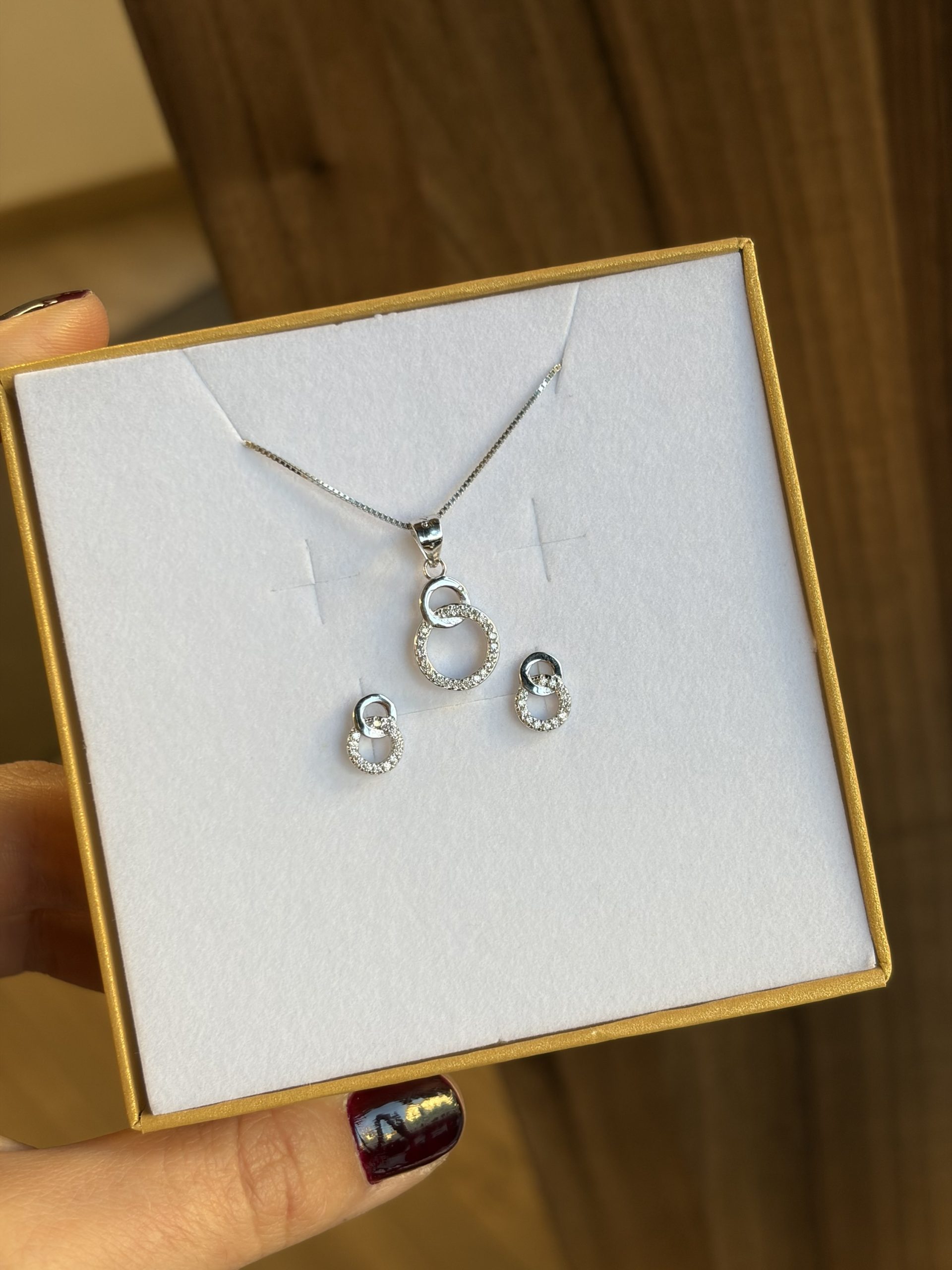 Ezüst szett – kettő egymásba fonódó karika cirkóniával. Fülbevaló & nyaklánc medállal. 925 finomságú ezüst.