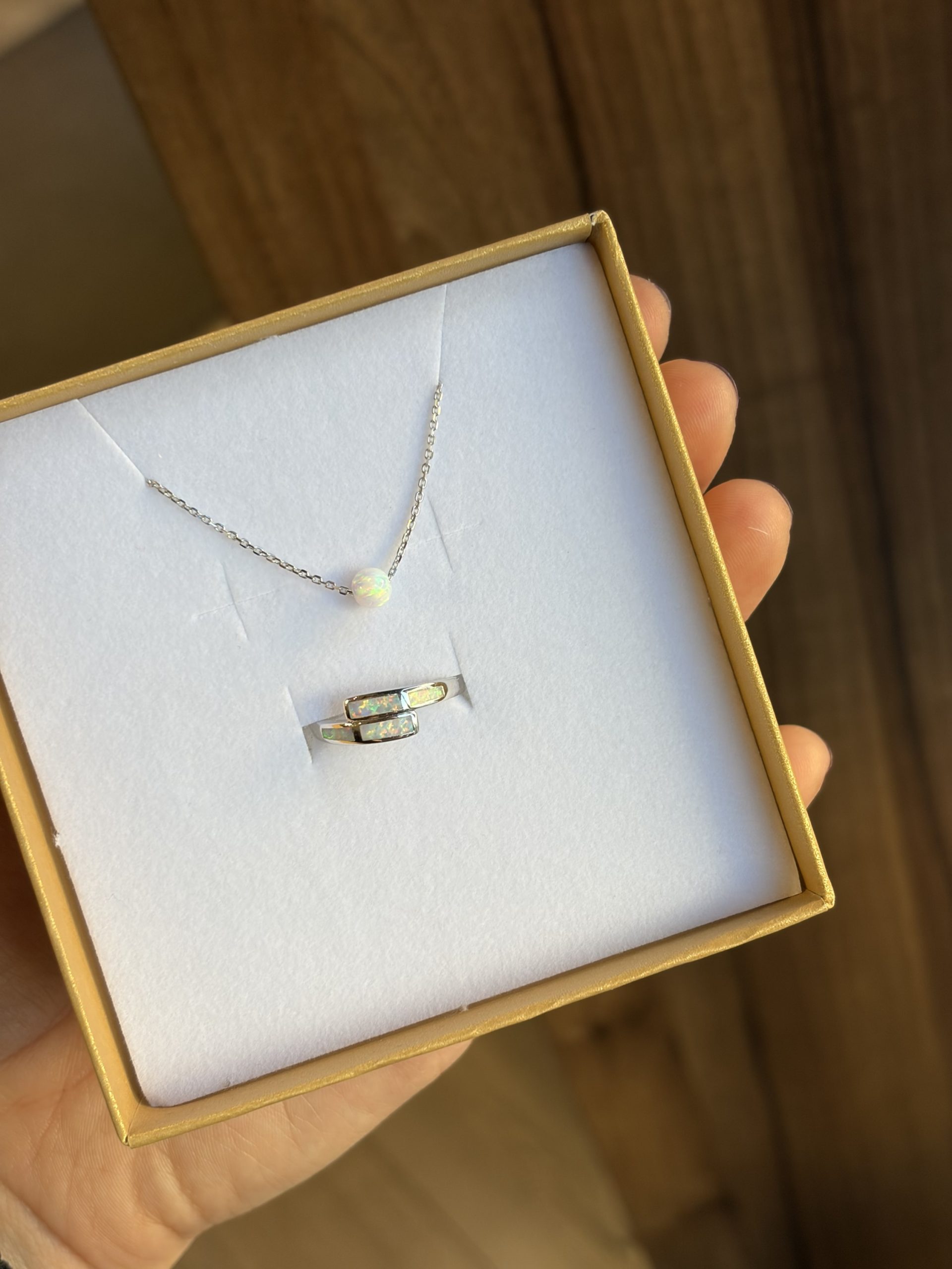 Ezüst fehér opálos szett. Nyaklánc & gyűrű. Gyűrű méret: 56. 925 finomságú ezüst.
